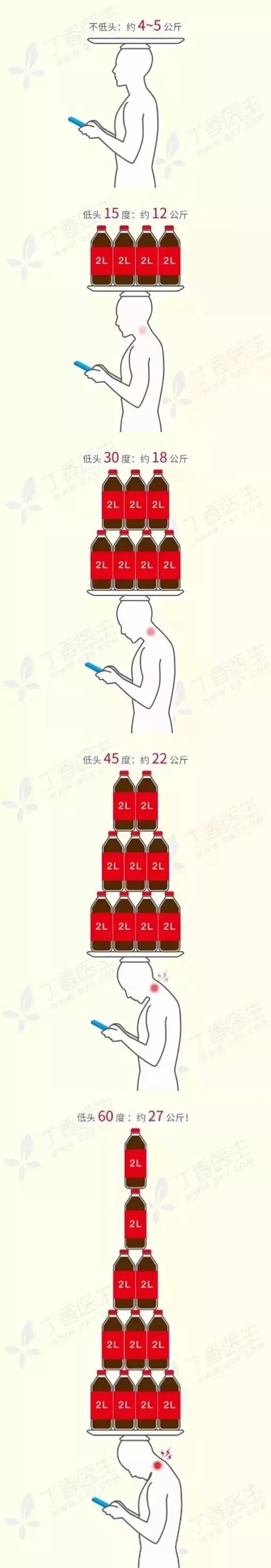 你知道人的頭多重嗎?5公斤左右。所以,當(dāng)你抬頭挺胸時,脖頸只需要承受約5公斤的重量。但是,在你前傾低頭60度看手機時,頸部就需承受25~30公斤的重量!