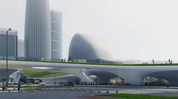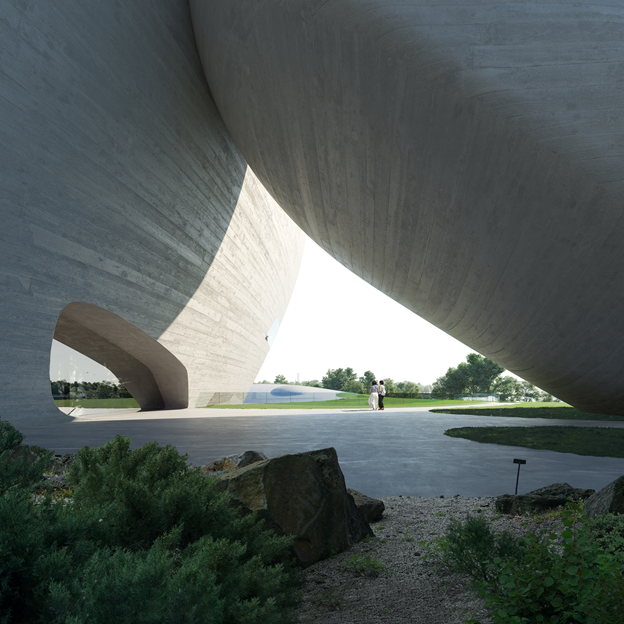 MAD的方案將較大體量的標(biāo)準(zhǔn)展覽空間、公共教育場地、圖書館、接待大堂、咖啡廳、配套商業(yè)等功能放置在首層并覆土,屋頂形成綠地與城市直接連接,構(gòu)成這個區(qū)域面積最大的公園。順應(yīng)建筑的曲線,屋頂坡度自然發(fā)展,柔和回落大地,接壤之處設(shè)計成數(shù)個下沉庭院,高低相合,延綿不斷。