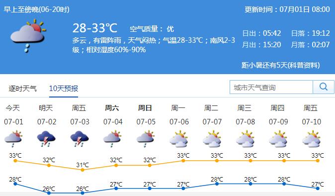 見(jiàn)圳客戶(hù)端·深圳新聞網(wǎng)2020年7月1日訊 我市今日晴天間多云,局地有短時(shí)(雷)陣雨;氣溫28-33℃,中北部及人口密集區(qū)最高氣溫可達(dá)35℃以上;偏南風(fēng)2-3級(jí);相對(duì)濕度60%-90%。