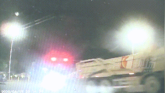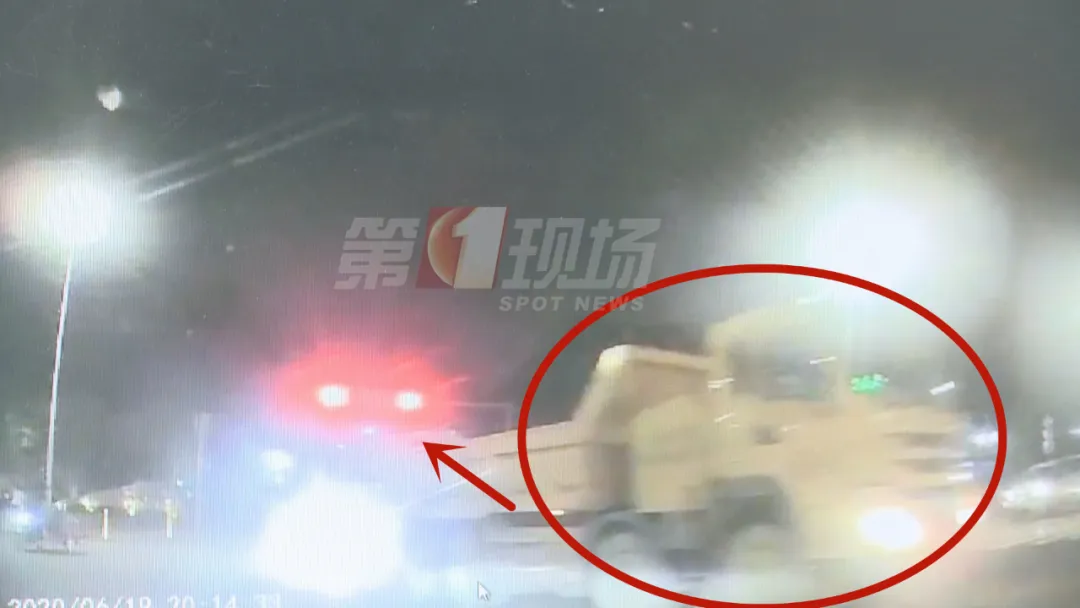 事故發(fā)生在6月19號晚上8點(diǎn)多,可以看到黑色小車在信號燈開始閃爍的時候開過光僑路路口,正好被一輛左轉(zhuǎn)泥頭車擋住了路。