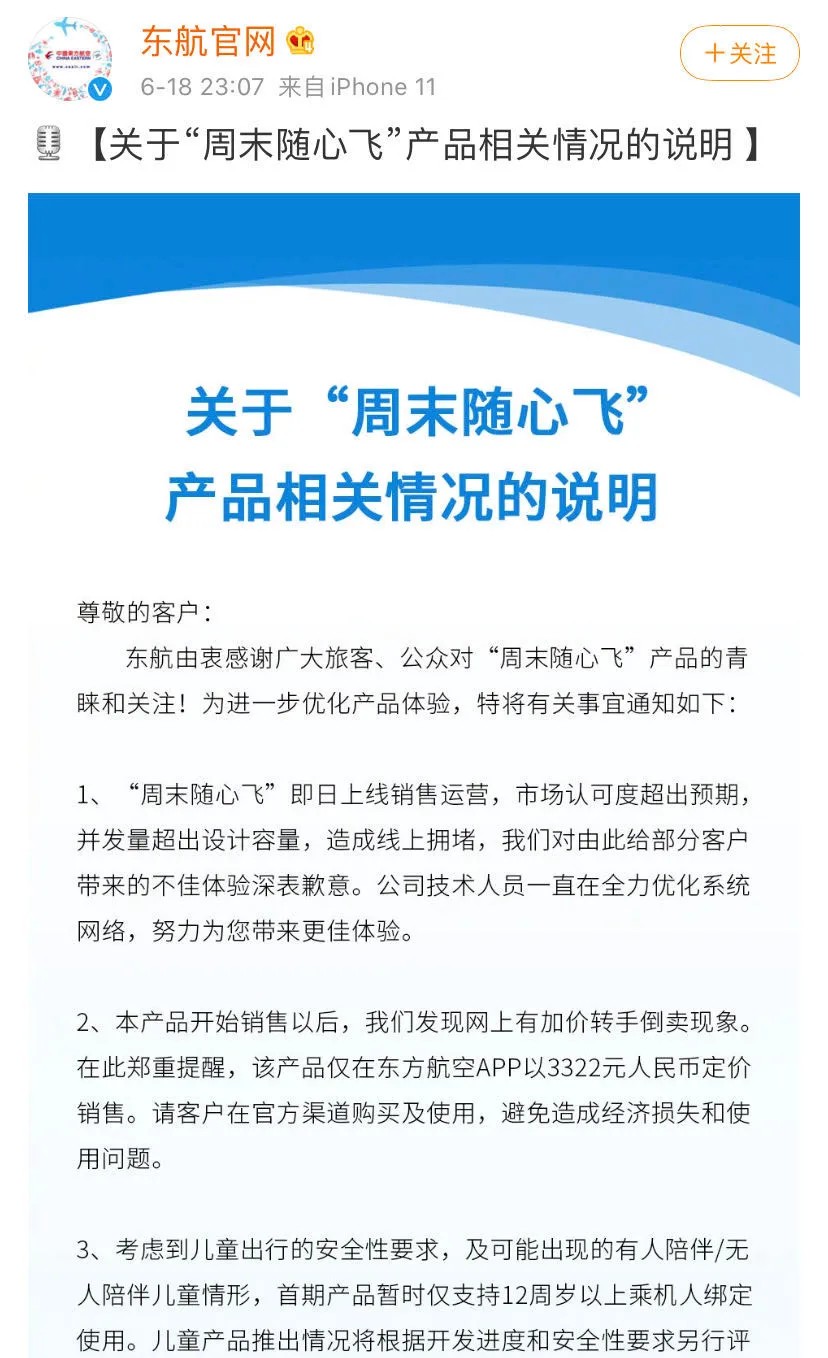 在官方微博,東航就“隨心飛”產(chǎn)品發(fā)表了一個說明,對用戶出現(xiàn)不好的體驗(yàn)致歉,并稱技術(shù)人員正在全力優(yōu)化系統(tǒng)網(wǎng)絡(luò),努力給用戶帶來好的體驗(yàn)。