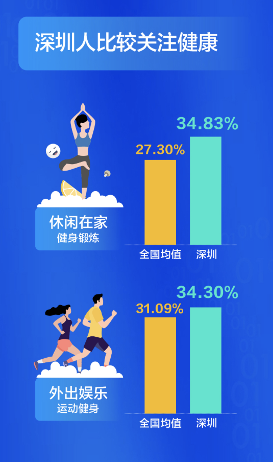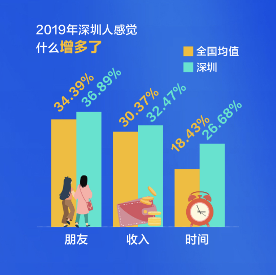 深圳人比較關(guān)注健康,不管是宅在家還是外出娛樂,他們選擇運(yùn)動健身的比例都超過全國平均水平,對健康的投資,成就了又一個“苗條之城”。過去這一年,有四成的深圳人感覺自已“輕松”了,體重減少的人群比例高出全國近14個百分點(diǎn)。甩掉了贅肉的同時,深圳人還感覺在時間、朋友、收入這三方面的收獲在增加。尤其是時間,超出了全國均值8個百分點(diǎn)。