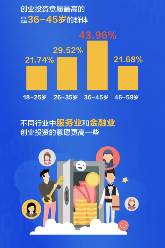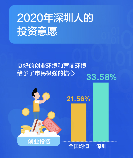 有了錢,深圳人會投資什么?大調(diào)查發(fā)現(xiàn),深圳人在創(chuàng)業(yè)投資的選擇占比高達(dá)33.58%,比全國平均水平要高出12個百分點(diǎn),良好的創(chuàng)業(yè)環(huán)境和營商環(huán)境給予了市民極強(qiáng)的信心。從不同年齡段來看,創(chuàng)業(yè)投資意愿最高的是36-45歲的群體,不同行業(yè)中,服務(wù)業(yè)和金融業(yè)創(chuàng)業(yè)投資的意愿更高一些。