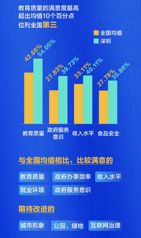 在針對城市治理能力和社會服務(wù)的20多項(xiàng)滿意度指標(biāo)中,深圳有19項(xiàng)高于全國省會城市和直轄市平均水平。其中,市民對教育服務(wù)的滿意度最高,超出均值10個百分點(diǎn),位列全國第三,其次是治安狀況和水、空氣質(zhì)量,而在政府服務(wù)意識和食品安全的滿意度,也排在全國同類第一名。此外,日常生活中的收入和就業(yè),也讓深圳人感覺比較踏實(shí)。