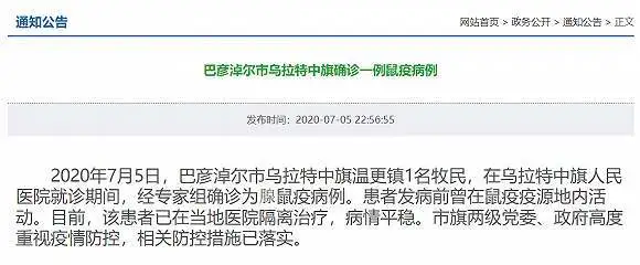 7月5日傍晚,內(nèi)蒙古巴彥淖爾市衛(wèi)生健康委員會(huì)發(fā)布通告稱(chēng),烏拉特中旗人民醫(yī)院報(bào)告了1例疑似腺鼠疫病例,經(jīng)研究決定,于7月5日發(fā)布鼠疫防控Ⅲ級(jí)預(yù)警。當(dāng)天晚間,巴彥淖爾市衛(wèi)生健康委員會(huì)再次發(fā)布通告稱(chēng),該市烏拉特中旗確診一例鼠疫病例。