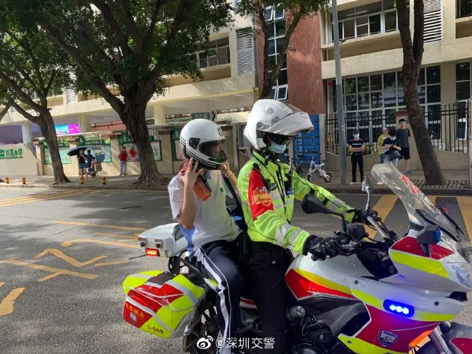 7月7日7時59分許,@深圳福田交警接報稱有家長需從寶安大道轉(zhuǎn)北環(huán)方向接送至福田區(qū)紅嶺中學(xué),為孩子送高考證件。鐵騎立即前往北環(huán)大道安托山路段待命,8時16分接到該家長車輛,8時21分順利送達(dá)學(xué)校。