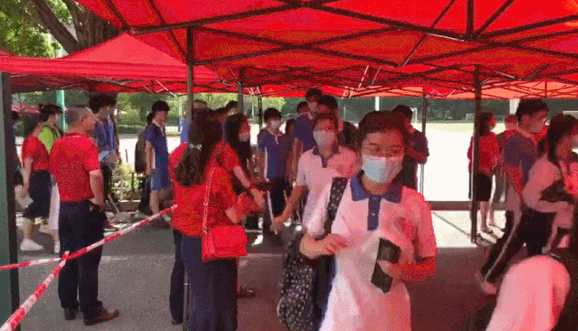 八點十分,學(xué)生走入考場,身穿紅色衣服的老師在兩側(cè)為考生送上祝福?!凹佑?!”“老師我們出發(fā)了?!弊8B暣似鸨朔?/p>
