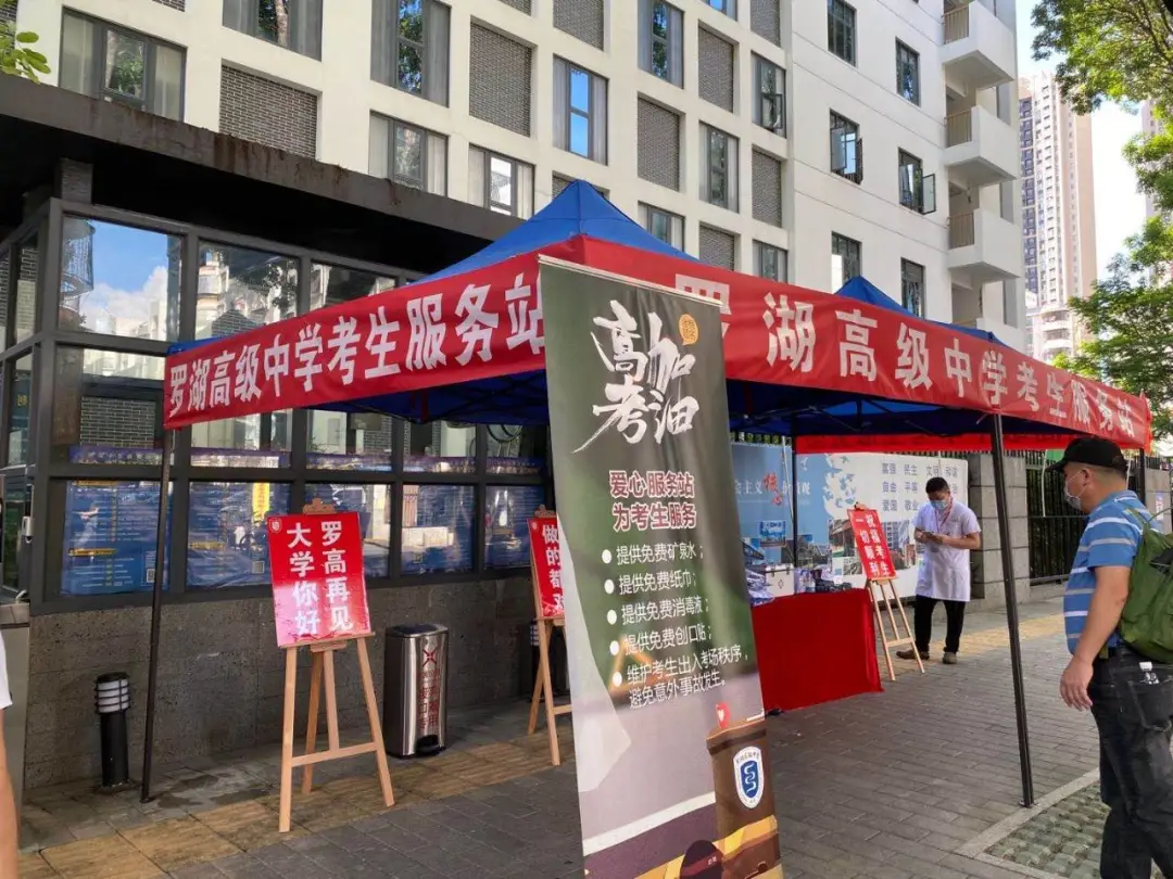 在羅湖高級中學,記者看到,在校門口右側(cè),設置了服務站,里面為考生準備了校服、文具、防疫用品、雨傘、紙巾、水等。