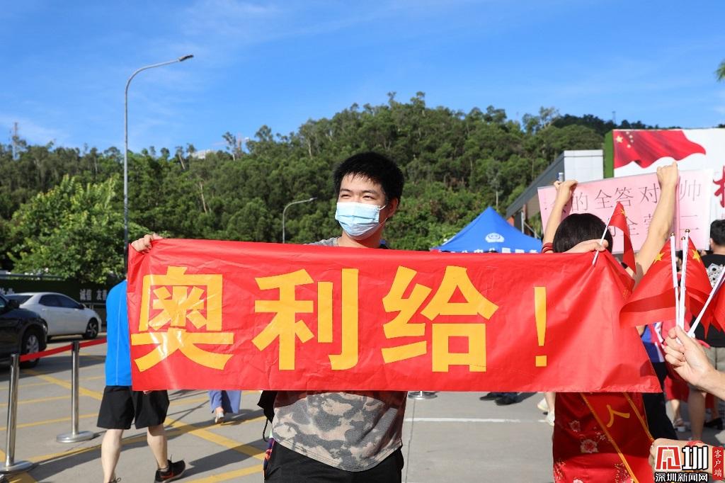 紅嶺中學考點外,“應(yīng)援團”成員為考生們舉起“奧利給”橫幅。