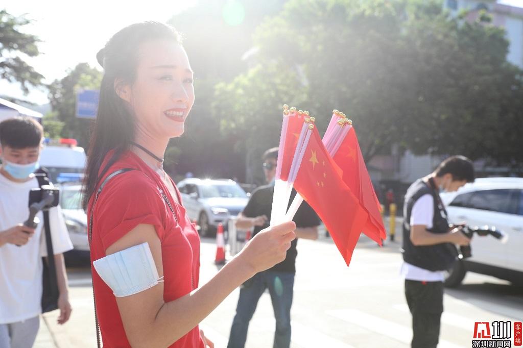 一名家長自費購買100個小國旗發(fā)放給考生,為他們加油助威。