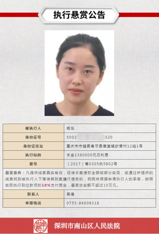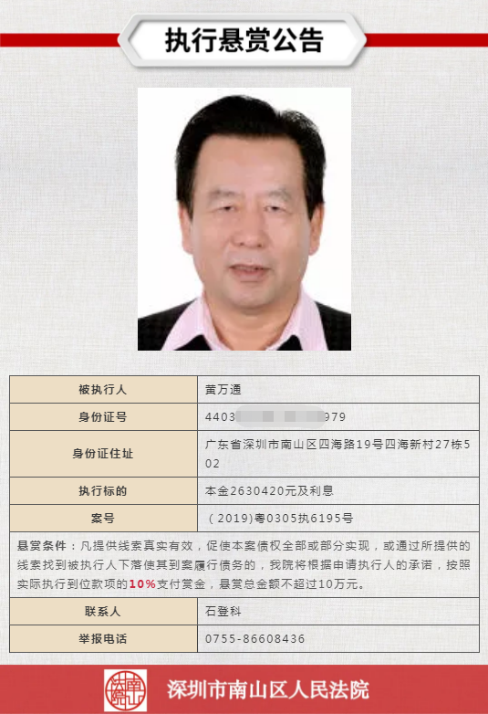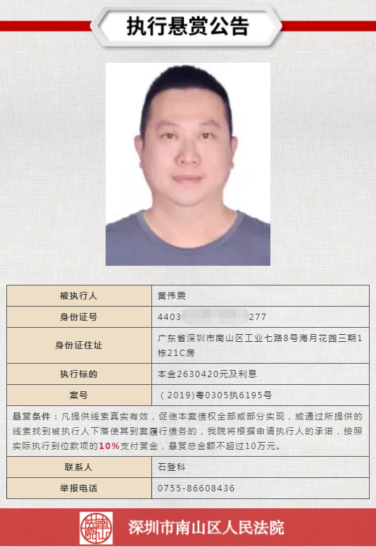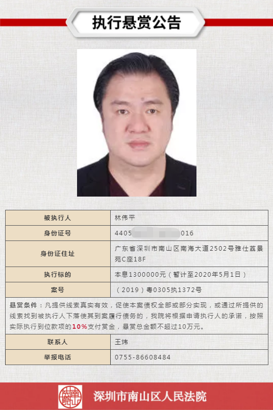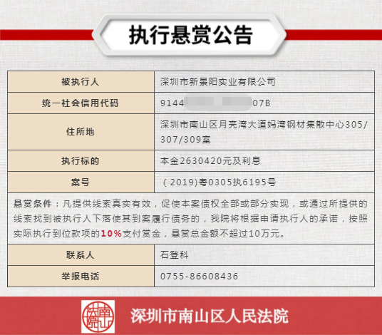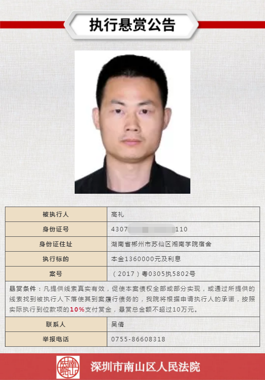 經(jīng)申請執(zhí)行人申請,深圳市南山區(qū)人民法院向社會發(fā)布懸賞舉報公告,凡提供線索真實有效,促使本案債權全部或部分實現(xiàn),或通過所提供的線索找到被執(zhí)行人下落使其到案履行債務的,深圳市南山區(qū)人民法院將根據(jù)申請執(zhí)行人的承諾,按照實際執(zhí)行到位款項給予一定金額的賞金。
