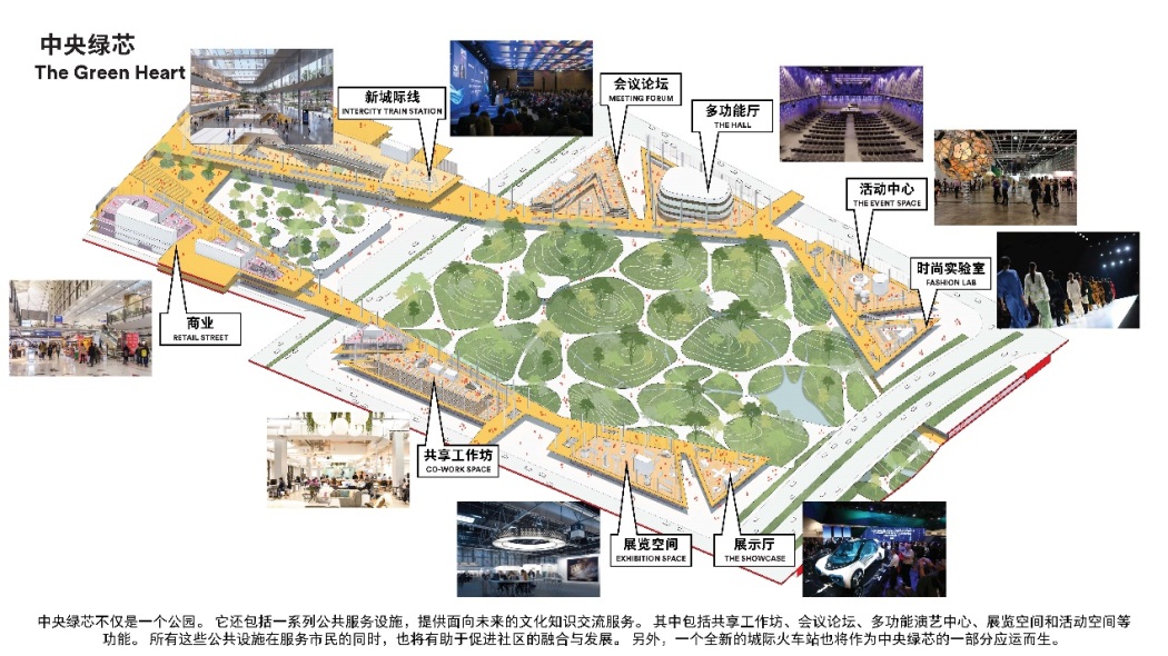 方案以獨(dú)特的“綠鏈都芯”為理念,打造一個(gè)耦合生態(tài)、交通和公共生活的超級(jí)樞紐。設(shè)計(jì)的中央綠芯引入大面積森林和草甸,使人們?cè)诔鞘兄兄赜鲎匀唬尡闭緲屑~地區(qū)既擁有大城市商務(wù)中心區(qū)的特質(zhì),也擁有郊外自然的品質(zhì),形成全新的都市生活體驗(yàn)。同時(shí),中央綠芯還包括會(huì)議論壇、多功能演藝中心等一系列公共服務(wù)設(shè)施,提供面向未來的文化知識(shí)交流服務(wù)。