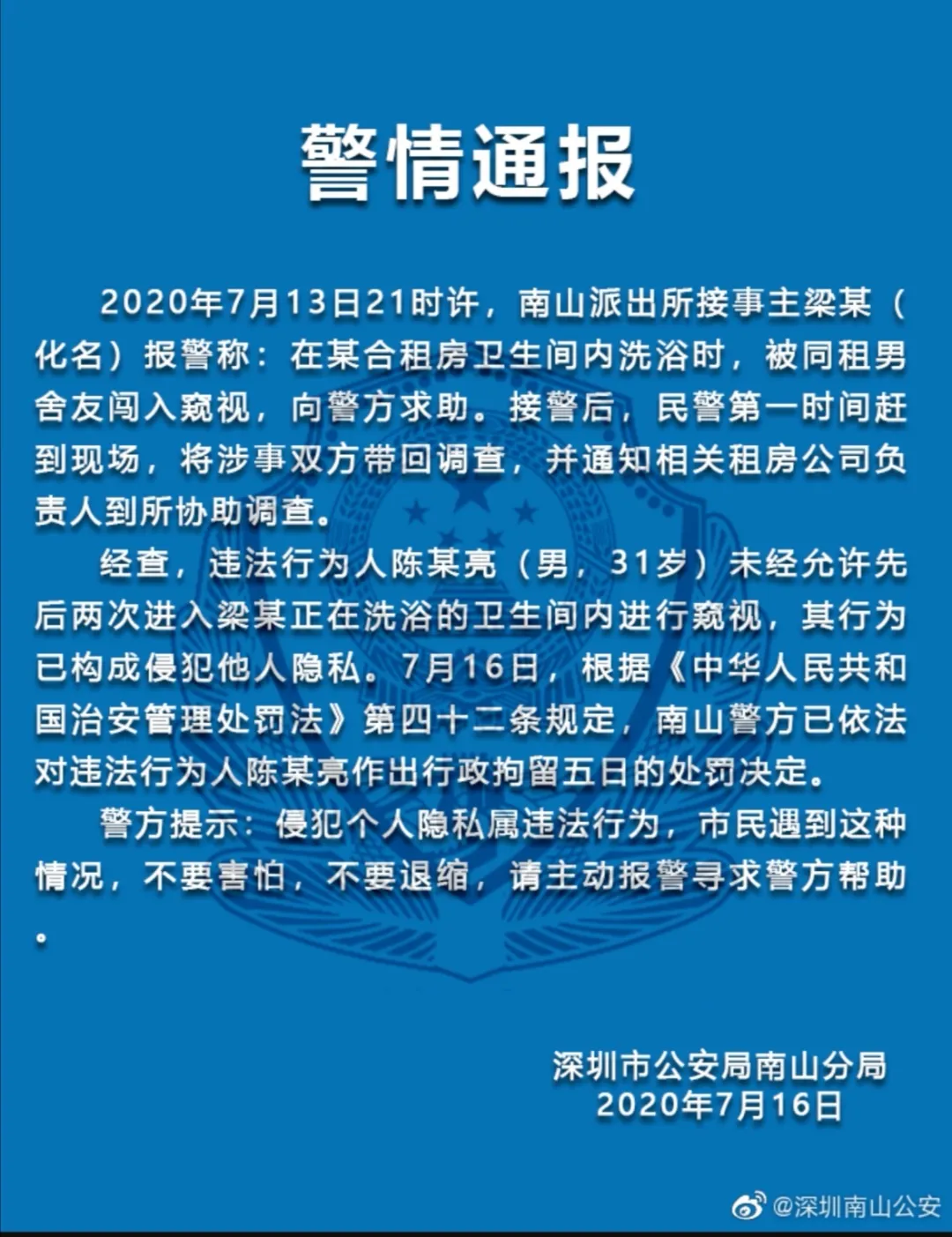 蛇口消息報(bào)2020年7月16日訊 7月16日,南山警方發(fā)布對“女生合租房衛(wèi)生間洗浴被同租男舍友闖入”事件的警情通報(bào),違法行為人陳某亮(男,31歲)行為已構(gòu)成侵犯他人隱私,南山警方已依法對陳某亮作出行政拘留5日的處罰決定。