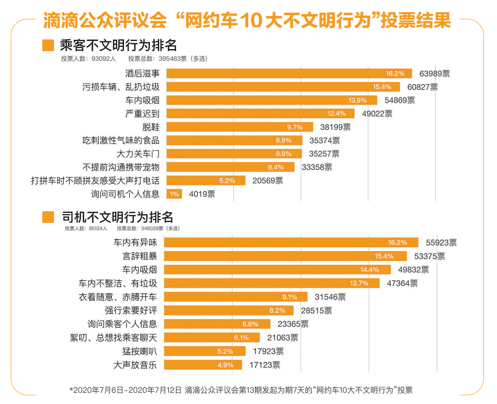 為進(jìn)一步優(yōu)化平臺規(guī)則和治理方向,滴滴公眾評議會第13期發(fā)起為期7天(7月6日至7月12日)的“網(wǎng)約車10大不文明行為”公眾投票和意見征集。本次活動累計(jì)178216人次投票,收到4533條用戶留言,用戶分享了打車中遇到的遭遇,并積極獻(xiàn)言獻(xiàn)策。其中,共93092人次參與乘客不文明行為投票,共投出395483票,乘客酒后滋事以63989票高居“網(wǎng)約車10大不文明行為”榜首,污損車輛、亂扔垃圾獲得60827票,車內(nèi)吸煙54869票,排名第三。