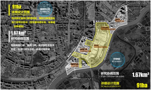 競賽由深圳市投資控股有限公司主辦,深港科技創(chuàng)新合作區(qū)發(fā)展有限公司承辦,深圳市規(guī)劃和自然資源局、深圳市建筑工務署、福田區(qū)人民政府為技術(shù)指導單位,旨在落實關(guān)于皇崗口岸片區(qū)遴選國際一流設計師進行整體設計、統(tǒng)一開發(fā)、連片建造的要求,通過“定向邀請5家+資格預審10家”的方式,遴選了15家國際知名設計機構(gòu)參賽。其中,詳細設計范圍包括現(xiàn)狀皇崗口岸貨檢區(qū)、口岸生活區(qū)及口岸周邊地塊,面積約0.91平方公里;研究協(xié)調(diào)范圍為河套C區(qū),包括詳細設計范圍及周邊的福田口岸、赤尾村等區(qū)域,面積1.67平方公里。