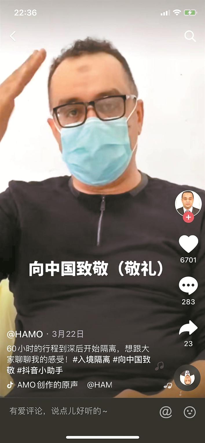 而在另一邊,方哈默也自愿當起了中國防疫宣傳大使,他用短視頻在抖音記錄了中國抗疫暖心舉措,向國內(nèi)外宣傳羅湖各項防疫措施,截至目前,他在抖音已收獲了2.4萬的點贊量。網(wǎng)友們紛紛留下了暖心的鼓勵“謝謝你的理解”“歡迎你來到中國”?!拔蚁壬莻€比較開朗的人,也很喜歡中國的生活環(huán)境,喜歡中國人,我們周圍的鄰居、朋友對我們很好,沒有因為現(xiàn)在的疫情就歧視外國人或不敢靠近。所以他的心態(tài)一直都不錯?!狈焦奶嬖V記者,其實,對于她的丈夫來說,中國已經(jīng)是他的第二個家鄉(xiāng)。在疫情發(fā)生以來,他一直孜孜不倦地向所有朋友分享著中國政府在此次疫情中所做的努力和貢獻。