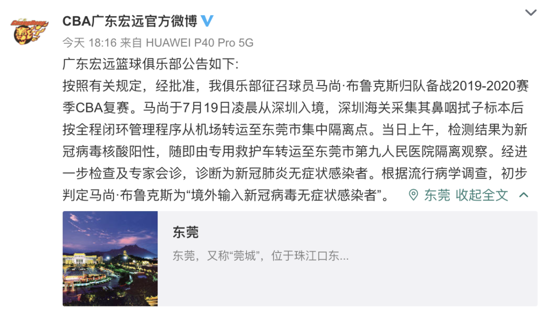 7月19日,廣東新增境外輸入無癥狀感染者1例,為東莞報告,來自美國,在入境口岸發(fā)現(xiàn)。經確認,此人是CBA廣東宏遠男籃外援馬尚·布魯克斯。