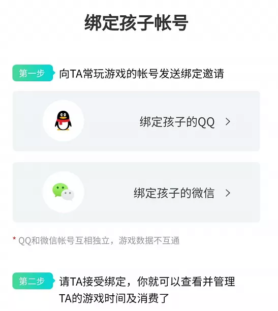 進(jìn)入系統(tǒng)后,可以選擇你是家長還是孩子,比如選擇家長后,可以選擇孩子是用你的賬號玩還是他自己的賬號,如果是他自己的賬號,就可以向他常玩的賬號發(fā)送綁定申請,這里同時(shí)支持微信和QQ。