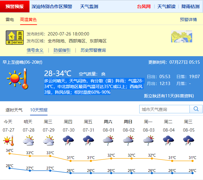 見(jiàn)圳客戶端?深圳新聞網(wǎng)2020年7月27日訊 根據(jù)深圳氣象局官方消息,深圳7月27日白天多云間晴天,天氣悶熱,有分散(雷)陣雨;氣溫28-34℃,中北部地區(qū)最高氣溫可達(dá)35℃或以上;西南風(fēng)3級(jí),陣風(fēng)6級(jí);相對(duì)濕度60%-90%。