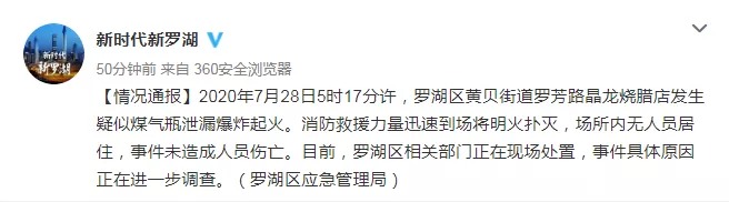 【情況通報(bào)】2020年7月28日5時(shí)17分許,羅湖區(qū)黃貝街道羅芳路晶龍燒臘店發(fā)生疑似煤氣瓶泄漏爆炸起火。消防救援力量迅速到場將明火撲滅,場所內(nèi)無人員居住,事件未造成人員傷亡。目前,羅湖區(qū)相關(guān)部門正在現(xiàn)場處置,事件具體原因正在進(jìn)一步調(diào)查。(羅湖區(qū)應(yīng)急管理局)