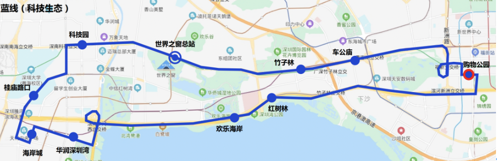 停靠站點(diǎn):世界之窗總站→竹子林→車公廟→購物公園→紅樹林→歡樂海岸→華潤深圳灣→海岸城→深大-騰訊站→科技園→世界之窗總站