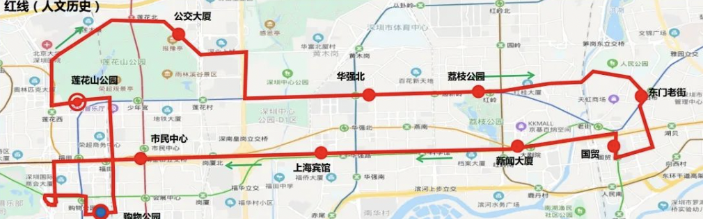 ??空军c(diǎn):蓮花山公交總站→公交大廈→華強(qiáng)北→荔枝公園→東門老街→國貿(mào)→新聞大廈→上海賓館→市民中心→購物公園地鐵站→蓮花山公園→蓮花山公交總站