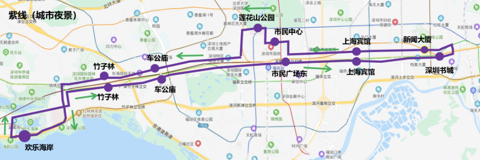 ??空军c(diǎn):歡樂海岸→竹子林→車公廟→市民廣場東→上海賓館→深圳書城→新聞大廈→上海賓館→市民中心→蓮花山公園→車公廟→歡樂海岸