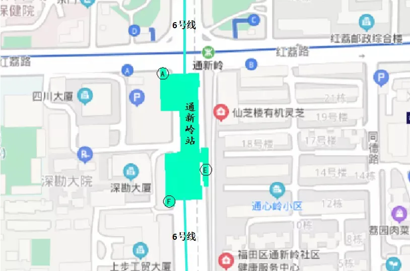 其中,A口位紅荔路,靠近四川大廈;E口位于上步路東側(cè),靠近通新嶺小區(qū);F口位于上步路西側(cè),靠近深勘大廈。