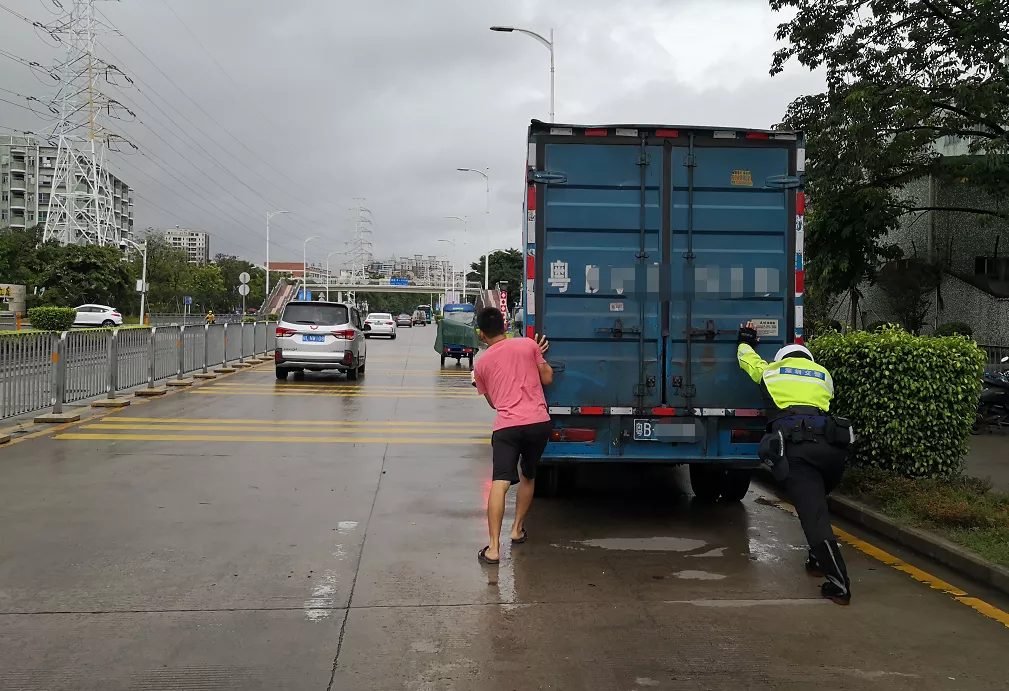 8月5日9時30分許,深圳交警鐵騎隊員雨中巡邏至新沙路時,發(fā)現(xiàn)德昌電機廠路段有一輛貨車停在路上,導致交通擁堵。貨車司機在旁,鐵騎上前詢問情況后得知貨車故障,司機被迫將車停在路邊。