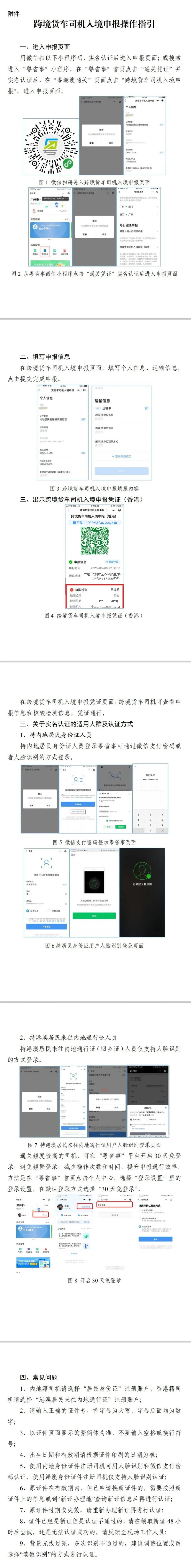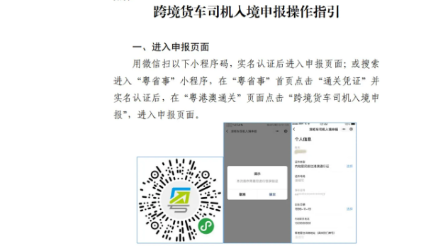 一、跨境司機(jī)入境前應(yīng)在“粵省事”微信小程序(粵省事—粵康碼—粵港澳通關(guān)—跨境貨車司機(jī)入境申報(bào))中準(zhǔn)確申報(bào)運(yùn)輸作業(yè)任務(wù)相關(guān)信息,包括作業(yè)目的地詳細(xì)信息(工廠/倉(cāng)庫(kù)名稱及所在街道)、內(nèi)地手機(jī)號(hào)碼及相關(guān)個(gè)人信息,相關(guān)操作指引詳見附件。入境后所申報(bào)手機(jī)號(hào)碼將會(huì)接收提醒短信。未安裝GPS定位系統(tǒng)和ETC電子不停車收費(fèi)系統(tǒng)的入境貨車,需按照相關(guān)部門安排前往指定場(chǎng)地免費(fèi)安裝GPS和ETC系統(tǒng)。