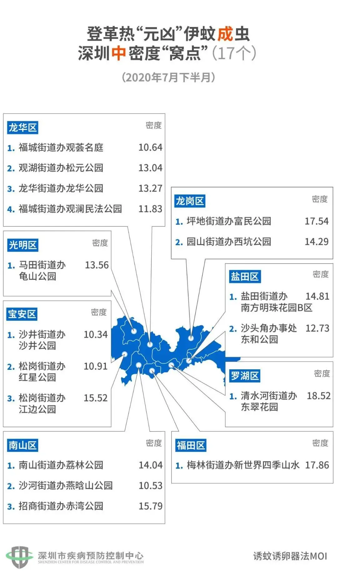下面的伊蚊分布圖就是登革熱風(fēng)險(xiǎn)地圖。中密度說(shuō)明有一定的登革熱傳播風(fēng)險(xiǎn),高密度則意味著,一旦有外部病例輸入,就可能在周邊片區(qū)引發(fā)登革熱流行。