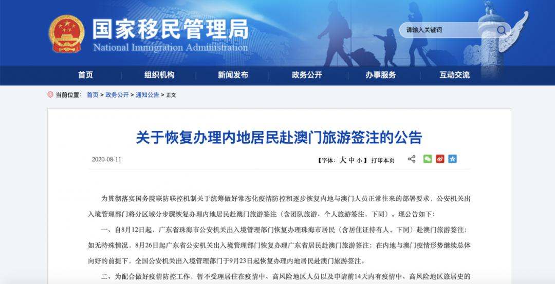 一、自8月12日起,廣東省珠海市公安機(jī)關(guān)出入境管理部門恢復(fù)辦理珠海市居民(含居住證持有人,下同)赴澳門旅游簽注;如無(wú)特殊情況,8月26日起,廣東省公安機(jī)關(guān)出入境管理部門恢復(fù)辦理廣東省居民赴澳門旅游簽注;在內(nèi)地與澳門疫情形勢(shì)繼續(xù)總體向好的前提下,全國(guó)公安機(jī)關(guān)出入境管理部門于9月23日起恢復(fù)辦理內(nèi)地居民赴澳門旅游簽注。