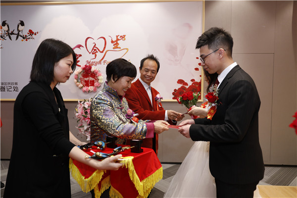 當天,區(qū)委常委、宣傳部部長呂漫妮,區(qū)政府副區(qū)長左金平和銀婚老人楊明剛、李玉芳夫婦從區(qū)民政局局長楊文秀手中接過聘書,正式成為羅湖區(qū)結婚登記特邀頒證師,四位特邀頒證師依次為12對新人頒發(fā)結婚證,送上誠摯祝福。