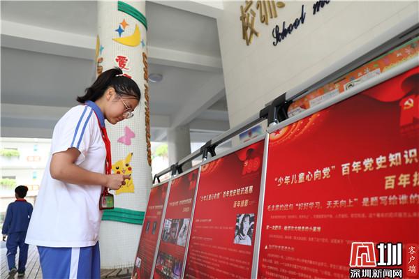 記者首先來到羅湖區(qū)翠北實驗小學,主題展板位于學校一樓大廳,有很多同學會在下課的時間來這里觀看學習。學校社工邱女士參與設(shè)計本次活動的時候想到,黨史對孩子們比較遙遠,想要讓孩子們深入學習就不能用大人的方式死板教條的灌輸,要調(diào)動孩子們的積極性,讓孩子們自己做“小講師”。