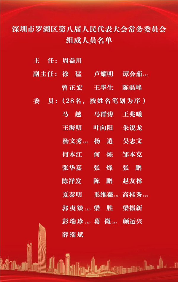 經(jīng)會(huì)議選舉,周益川當(dāng)選羅湖區(qū)第八屆人大常委會(huì)主任,范德繁當(dāng)選羅湖區(qū)人民政府區(qū)長(zhǎng),姚文勝當(dāng)選羅湖區(qū)監(jiān)察委員會(huì)主任。徐猛、盧耀明、譚會(huì)茹、曾正宏、王華生、陳磊峰當(dāng)選羅湖區(qū)第八屆人大常委會(huì)副主任。左金平、夏東、于紅軍、馮健、肖嘉睿、詹輝、霍廣勇當(dāng)選羅湖區(qū)人民政府副區(qū)長(zhǎng)。楊爽當(dāng)選羅湖區(qū)人民法院院長(zhǎng)。張彬當(dāng)選羅湖區(qū)人民檢察院檢察長(zhǎng),根據(jù)法律規(guī)定,須報(bào)經(jīng)市人民檢察院檢察長(zhǎng)提請(qǐng)市人大常委會(huì)批準(zhǔn)。獲頒當(dāng)選證書(shū)后,新當(dāng)選人員向憲法宣誓就職。