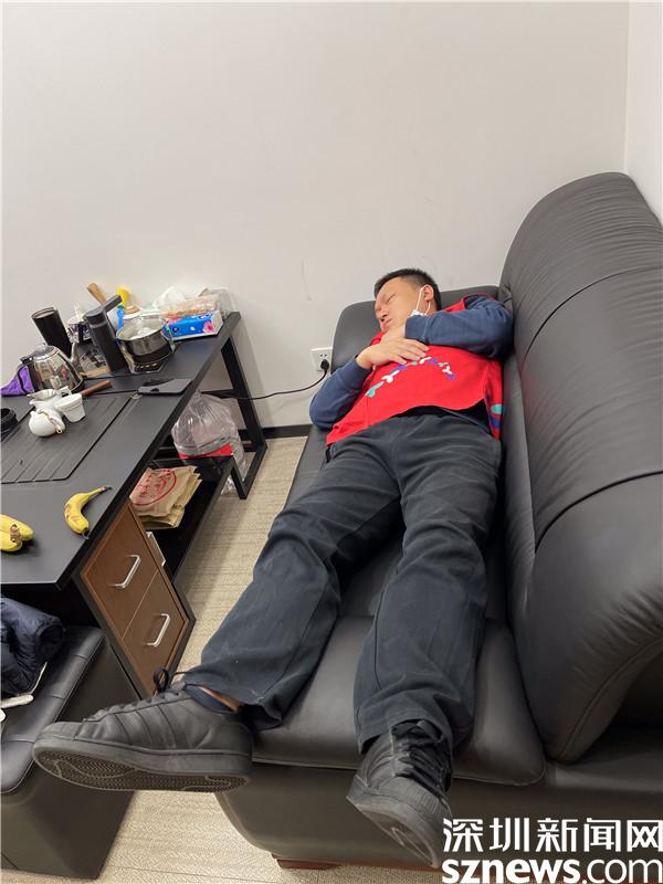 1月10日凌晨5點(diǎn)多,桂園街道桂木園社區(qū)黨委書記劉劍從核酸檢測(cè)點(diǎn)回來,躺在辦公室的沙發(fā)上,連身上的紅馬甲都沒有脫就睡著了。