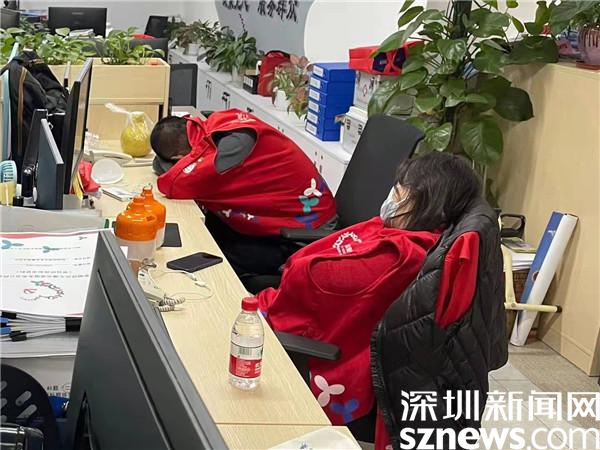 桂園街道疫情防控志愿者1月10日晚上工作到凌晨5點(diǎn)多做數(shù)據(jù)核查,在辦公室的椅子上睡著了。