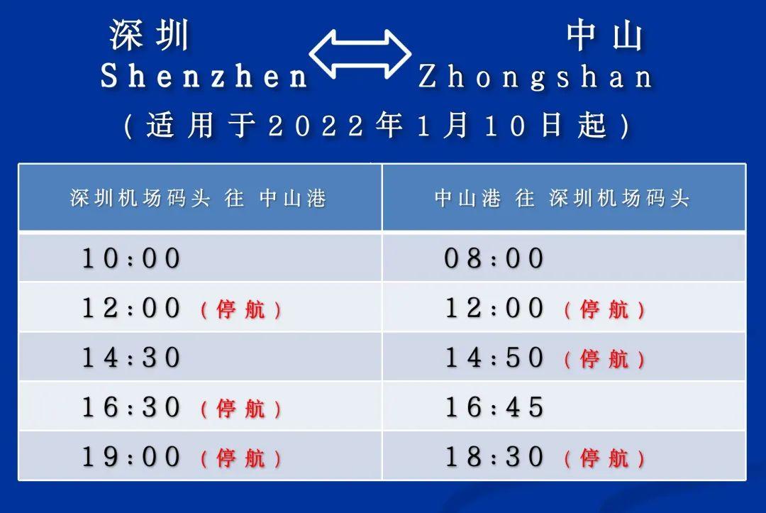 同時,1月10日起,深圳機場碼頭至中山港航線船班保留每日2進(jìn)2出:10:00、14:30 深圳機場碼頭出發(fā)前往中山港;08:00、16:45 中山港出發(fā)前往深圳機場碼頭。