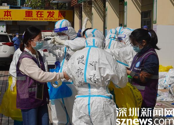臘八節(jié)剛過,深圳帶著些許涼意,卻也是艷陽高照?!巴緜儯嗷z查一下手腕腳腕有沒有貼好!穿戴整齊后準備集結出發(fā)啦!”在封控區(qū)外圍的醫(yī)護人員整備區(qū),一群身穿防護服、全副“武”裝的工作人員整裝待發(fā),兩人一組,目光堅定,向著封控區(qū)的入口走去。