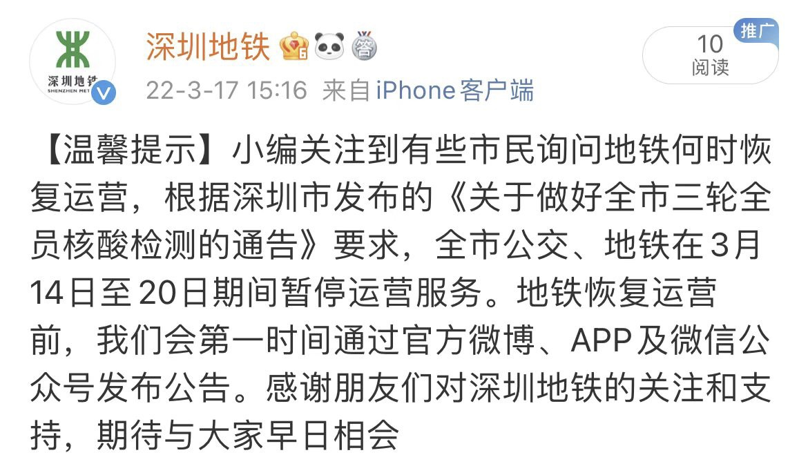 對此,記者向深圳地鐵求證,深圳地鐵表示,根據(jù)深圳市發(fā)布的《關(guān)于做好全市三輪全員核酸檢測的通告》要求,全市公交、地鐵在3月14日至20日期間暫停運營服務(wù)。地鐵恢復(fù)運營前,深圳地鐵會第一時間通過官方微博、APP及微信公眾號發(fā)布公告。