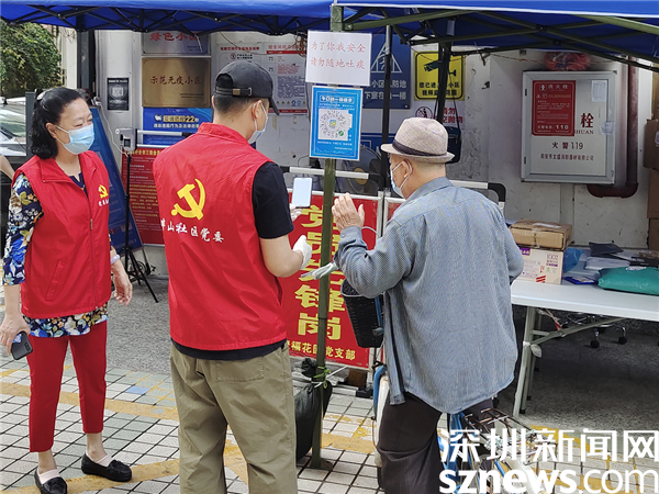 3月21日上午,在聚?;▓@黨員先鋒崗,老黨員張瑩和年輕黨員藍(lán)國亮在幫助居民掃場所碼。像這樣的新老黨員齊上陣,在畔山社區(qū)各黨支部還有很多,近日,轄區(qū)各核酸采樣點、小區(qū)出入口和城中村圍合卡點,處處可見鮮紅的黨旗和忙碌的紅馬甲,他們用實際行動影響并帶動更多的熱心市民群眾參與社區(qū)服務(wù),為一線防疫工作“添磚加瓦”。