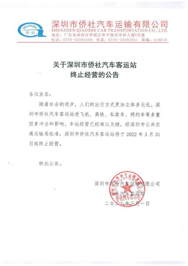 近日,記者從深圳市交通運輸局羅湖管理局獲悉,自2022年3月31日起,深圳市僑社汽車客運站終止經(jīng)營,這個營業(yè)了31年的“老牌”汽車客運站,正式宣布退休。