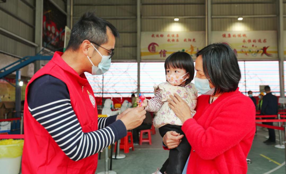 △ 關(guān)工委委員吳慶峰安撫剛做完核酸的小朋友