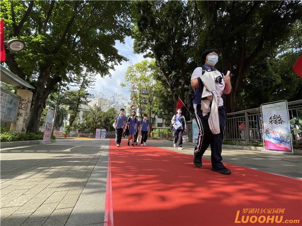 藍(lán)天白云下,背著書包的莘莘學(xué)子走上紅毯,一旁的幕布寫著偌大的八個字:羅湖實(shí)驗(yàn)、歡迎回家。深圳市羅湖實(shí)驗(yàn)學(xué)校的返校頗具儀式感,校門口一席紅毯,校園欄桿彩旗飄飄,孩子們在一片喜氣洋洋的氛圍中回到學(xué)校。