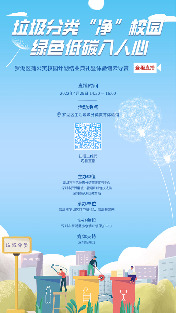 4月29日下午2:30—4:00,羅湖區(qū)首期蒲公英教師培訓(xùn)迎來結(jié)業(yè),羅湖區(qū)垃圾分類體驗(yàn)館館經(jīng)歷多月重整布展后煥新重開,屆時(shí),深圳市生活垃圾分類管理事務(wù)中心、羅湖區(qū)城市管理和綜合執(zhí)法局和羅湖區(qū)教育局共同舉辦垃圾分類“凈”校園綠色低碳入人心——羅湖區(qū)蒲公英校園計(jì)劃結(jié)業(yè)典禮暨科普館云導(dǎo)賞活動(dòng),深圳新聞網(wǎng)將進(jìn)行全程直播,歡迎各位網(wǎng)友觀看。