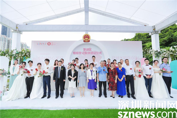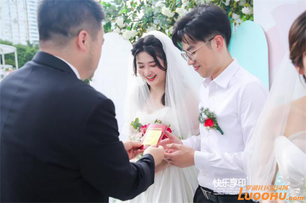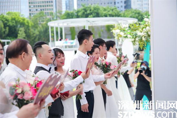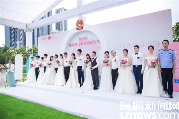 羅湖區(qū)委常委、宣傳部部長呂漫妮,羅湖區(qū)民政局局長楊文秀,羅湖區(qū)民政局副局長藍茜,2021年深圳市“最美家庭”的獲得者李道倫和王蓬勃夫婦,羅湖公益“紅娘”汪朝暉作為特邀頒證師,分別給9對新人頒證。
