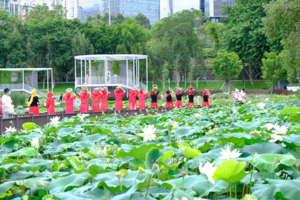 走進(jìn)公園,映入眼簾的是一望無際的荷葉。一陣微風(fēng)拂過,嫩綠的蓮蓬輕輕點(diǎn)頭,碩大的荷葉隨風(fēng)搖擺,讓人心曠神怡。荷塘邊,身著紅色連衣裙的阿姨們正隨著音樂舞動(dòng);池塘的另一頭,身著碧綠服裝的阿姨們熱情洋溢地表演著扇子舞。