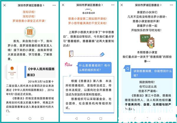 為進一步宣傳《慈善法》,普及慈善知識,羅湖區(qū)慈善會通過“深圳市羅湖區(qū)慈善會”微信公眾號推出三期“慈善知識知多少”宣傳,針對慈善活動、慈善組織、慈善捐贈、慈善募捐、稅收優(yōu)惠等內(nèi)容,向社會公眾普及慈善知識,傳播慈善理念,培育公民慈善意識,規(guī)范慈善行為,倡導社會各界一起學善、知善、行善,弘揚慈善文化,營造良好慈善氛圍。