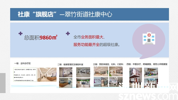 2021年3月,全市業(yè)務(wù)面積最大、服務(wù)功能最齊全的羅湖醫(yī)院集團(tuán)翠竹街道社康中心投入使用??偯娣e9860平方米共有4層,分設(shè)不同功能區(qū)。一樓為診療區(qū),涵蓋全科診療區(qū)、專(zhuān)家工作室、醫(yī)學(xué)影像檢查區(qū)等;二樓為健康管理區(qū),為居民提供全周期的健康體檢及檢后健康管理服務(wù),還設(shè)有超聲、檢驗(yàn)、DR等科室;三樓為預(yù)防保健區(qū),口腔科、婦科,四樓為高危兒早期康復(fù)中心、名中醫(yī)館、中醫(yī)康復(fù)理療區(qū)。