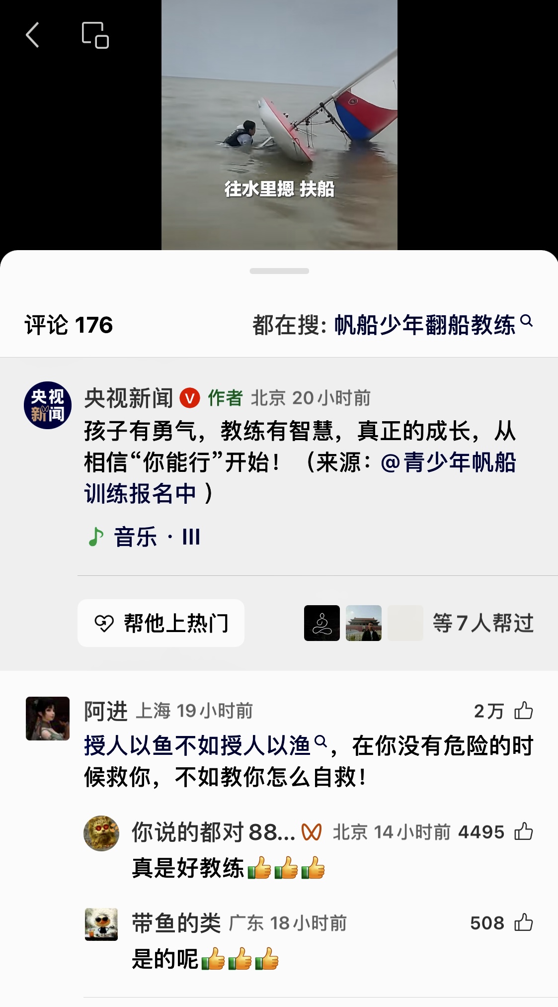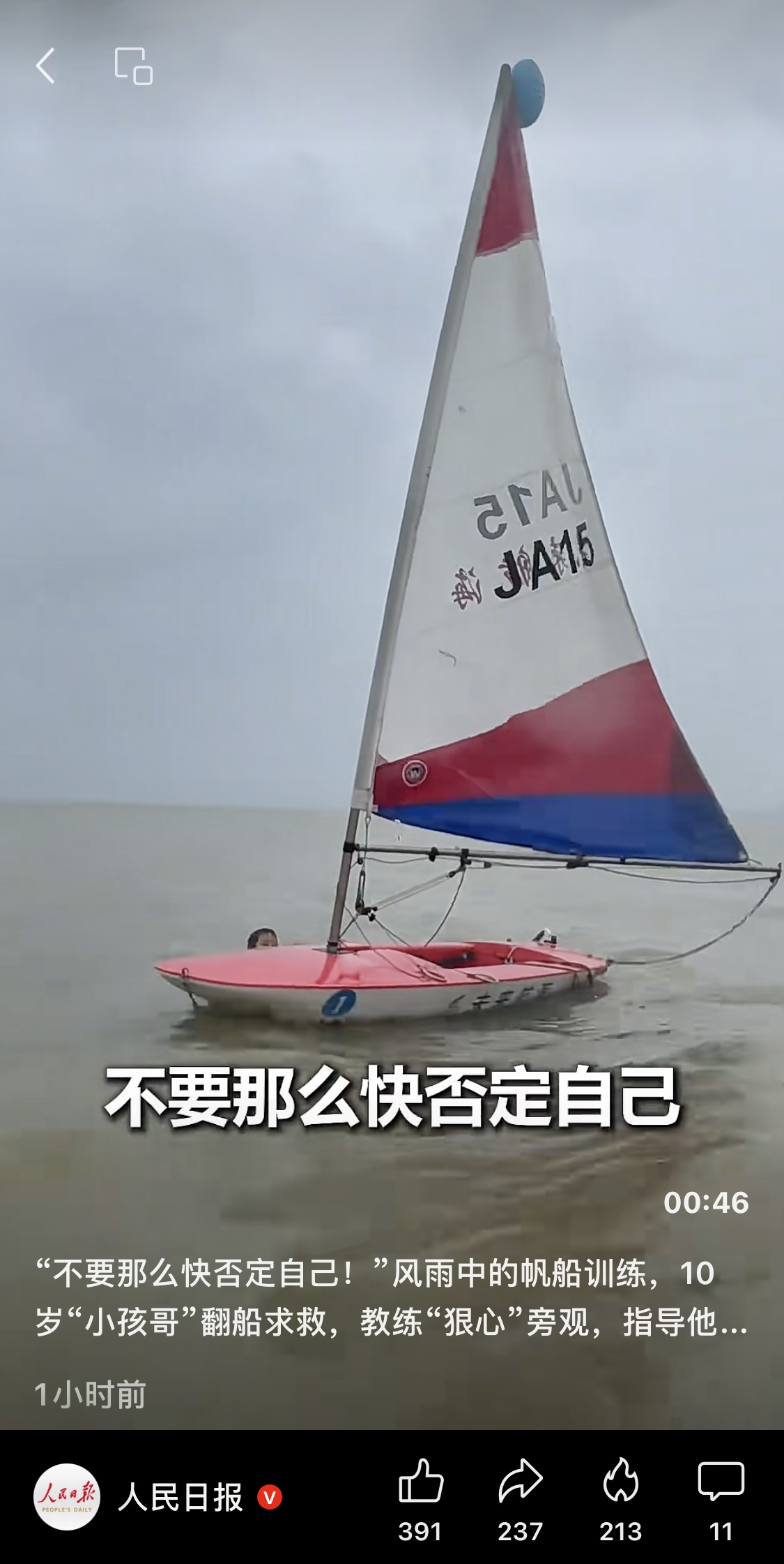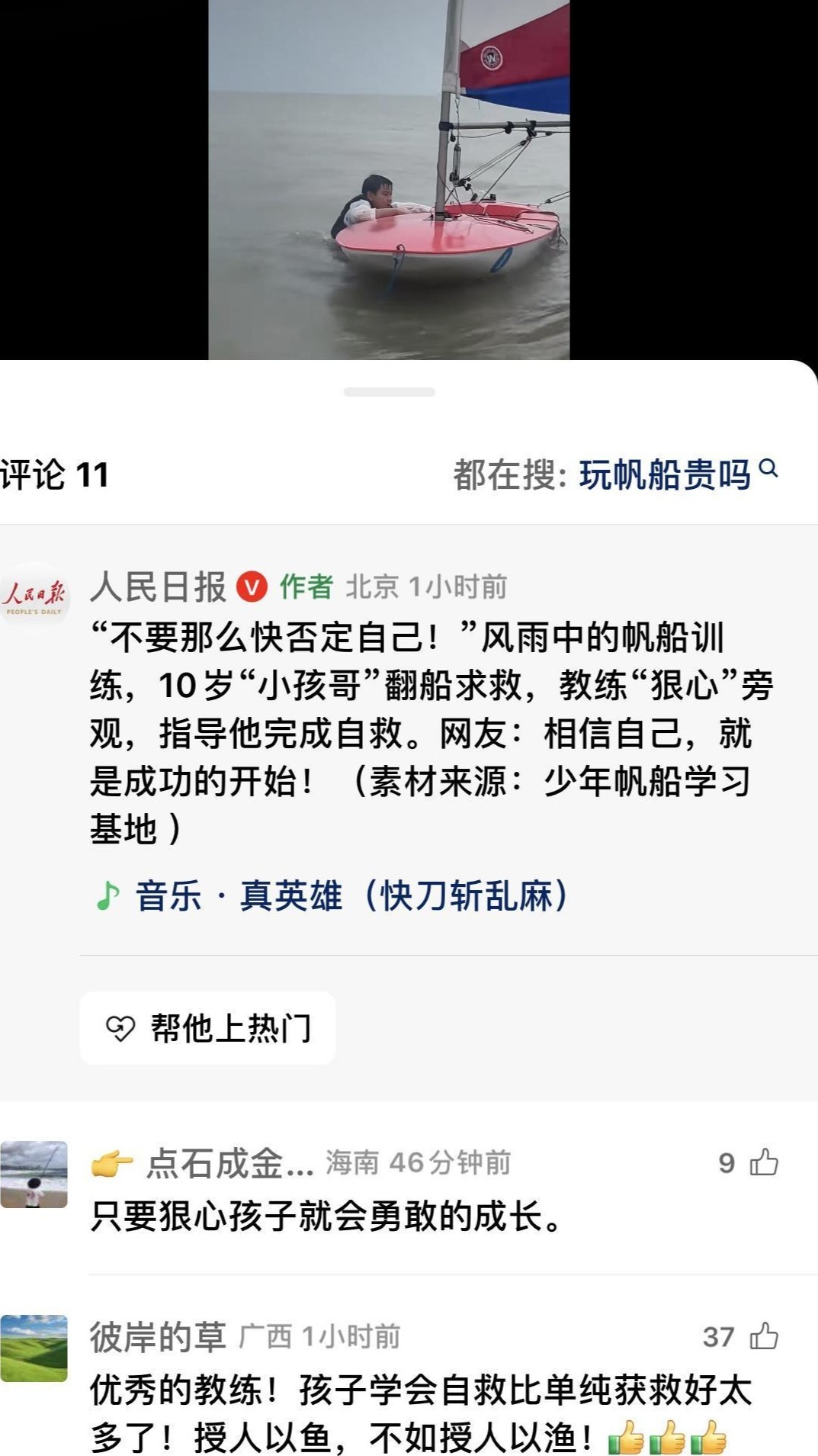 這段視頻經(jīng)傳播后獲得眾多網(wǎng)友稱贊,大家紛紛為這位敢于放手、引導(dǎo)孩子獨立解決困難的教練點贊,稱其為孩子人生的良師。央視新聞視頻號轉(zhuǎn)發(fā)并評論:“孩子有勇氣,教練有智慧,真正的成長,從相信‘你能行’開始!”人民日報視頻號也同步轉(zhuǎn)發(fā),文案為:“不要那么快否定自己!”風(fēng)雨中的帆船訓(xùn)練,10歲“小孩哥”翻船求救,教練“狠心”旁觀指導(dǎo)其完成自救,這樣的情節(jié)觸動了無數(shù)網(wǎng)友,大家感慨相信自己就是成功的開始。